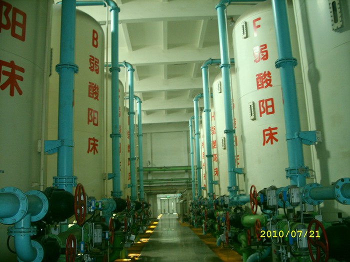 鋼襯膠混床,正常工作時,陰陽離子樹脂按一定比例合在一起進一步去除水中溶解性離子,設計不同組合其出水電導可達到1~18M-cm 。均勻混合的樹脂層中,陽樹脂與陰樹脂緊密地交錯排列,每一對陽樹脂與陰樹脂顆粒似于一組復床,混床就象無數組串聯運行的復床。通過混合離子交換后進入水中的氫離子與氫氧離子會立即生成電離度很低的水分子(H2O),很少可能形成陽離子或陰離子交換時的反離子,因而能制取純度相當高的成品水。